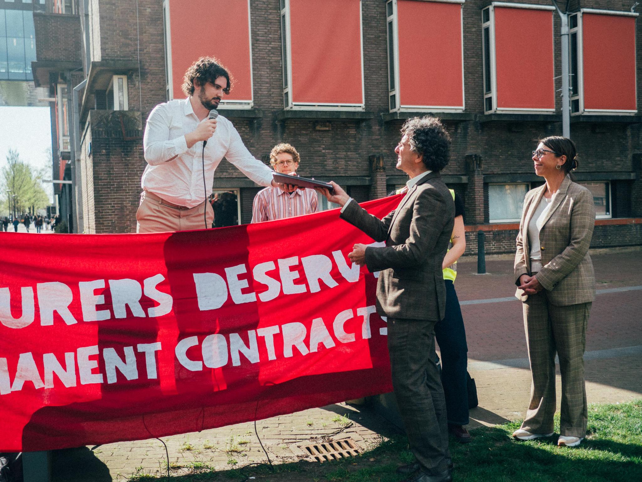 After three impassioned speeches, the moment had finally arrived to hand over the petition to Rector Magnificus Peter-Paul Verbeek. Antoine Germain, an organizer at CasualUvA, first read the petition’s demands aloud and then handed the petition to Peter-Paul. He accepted it and promised to take it “seriously,” but did not appreciate the demand to provide a response within three weeks. To what extent he and the rest of the Executive Board will heed the junior lecturers’ demands remains to be seen. However, what will further increase the pressure is that the FNV, during the new collective bargaining negotiations currently underway, is also demanding permanent contracts—something the FNV is doing in part because the junior lecturers have been advocating for this for so long.